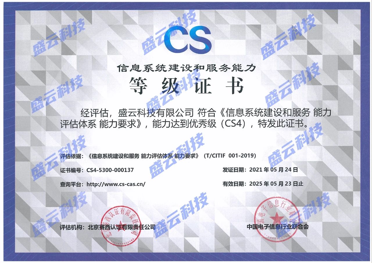 盛云科技通過CS4(優(yōu)秀級(jí))信息系統(tǒng)建設(shè)和服務(wù)能力資質(zhì)等級(jí)認(rèn)證